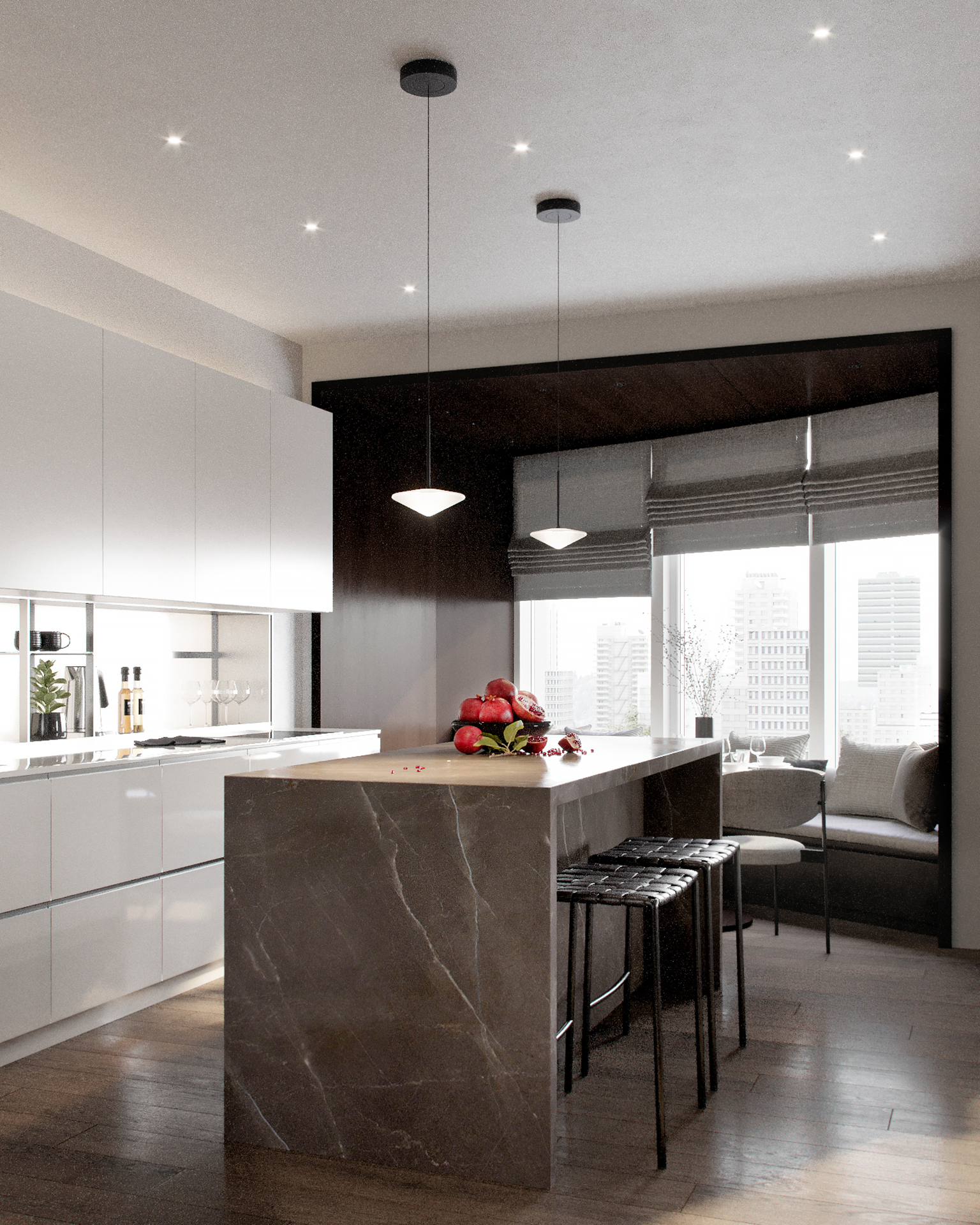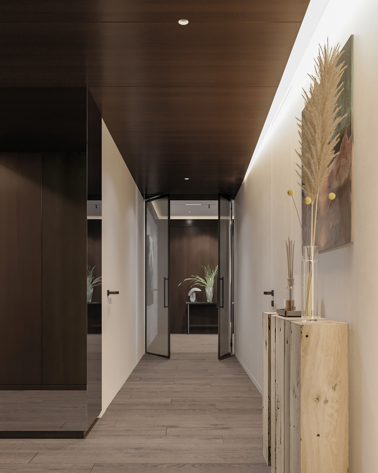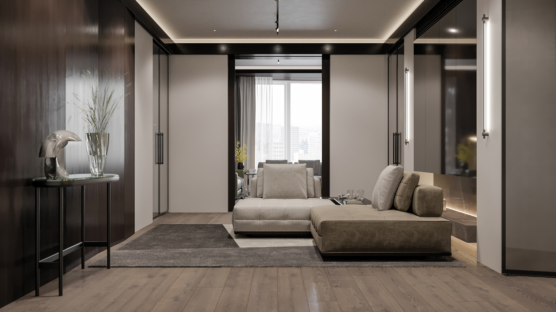 Апартаменты в ЖК Долина Сетунь. Проект квартиры для семьи с двумя детьми. Современный интерьер выполнен в спокойной цветовой гамме, натуральные материалы отделок - камень, шпон, создают атмосферу роскоши и комфорта.