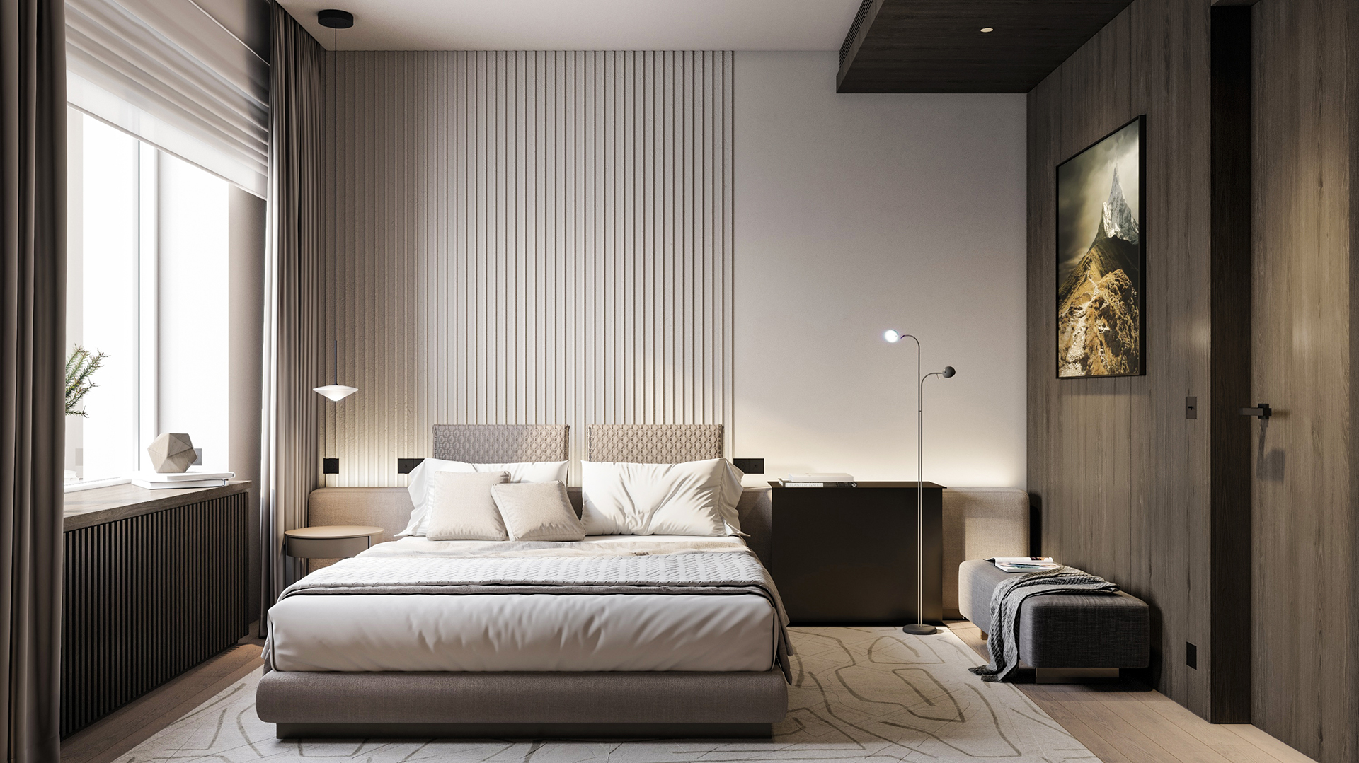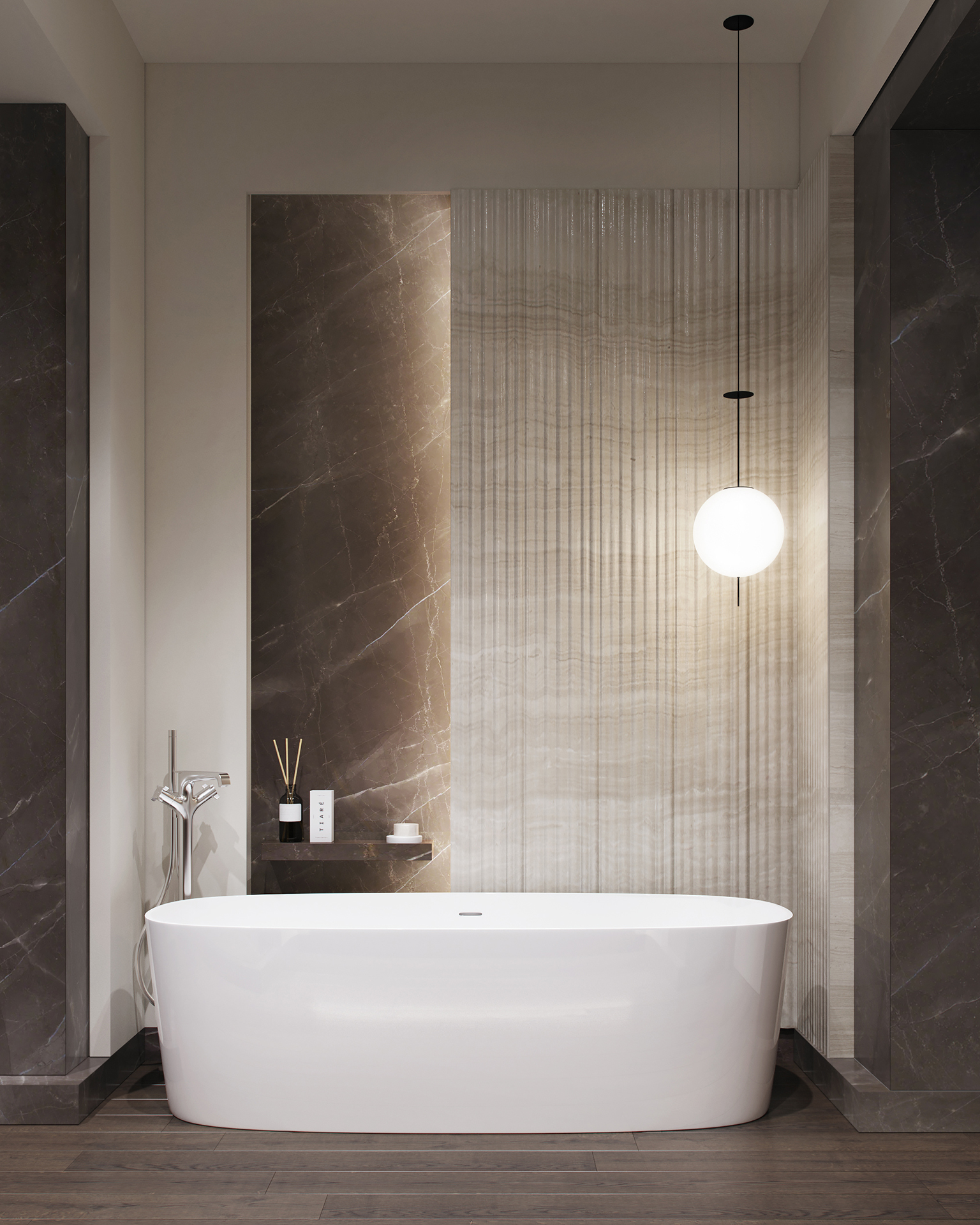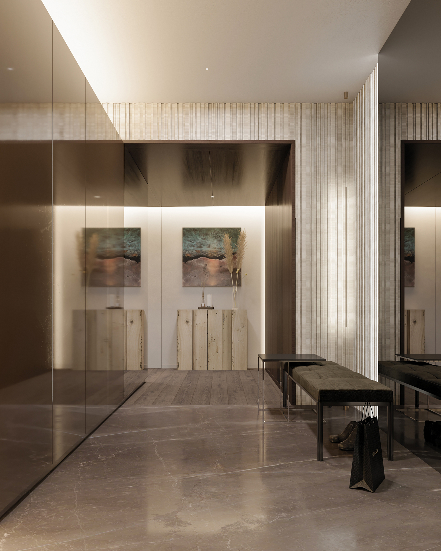 Апартаменты в ЖК Долина Сетунь. Проект квартиры для семьи с двумя детьми. Современный интерьер выполнен в спокойной цветовой гамме, натуральные материалы отделок - камень, шпон, создают атмосферу роскоши и комфорта.