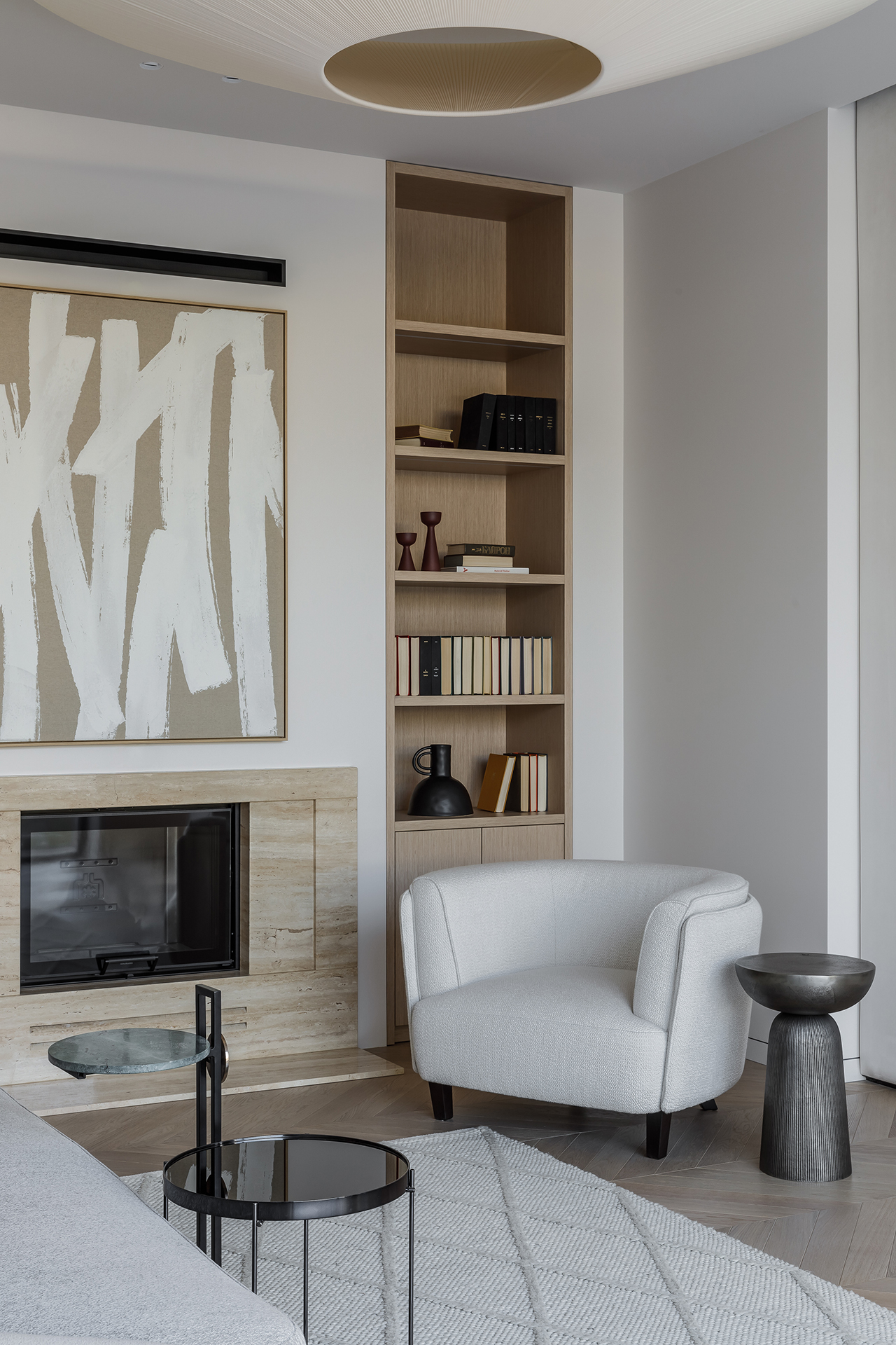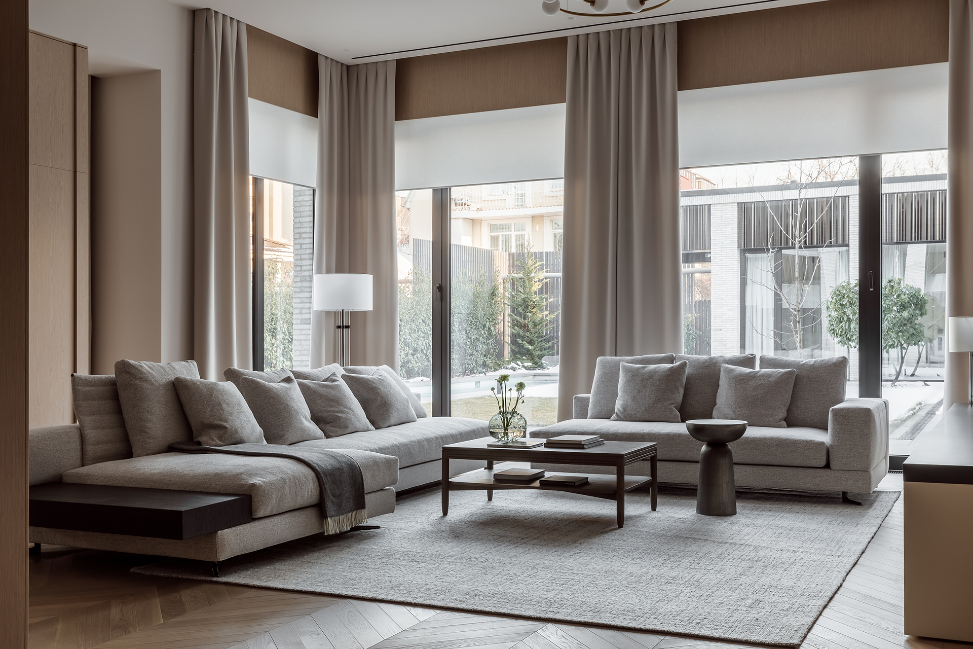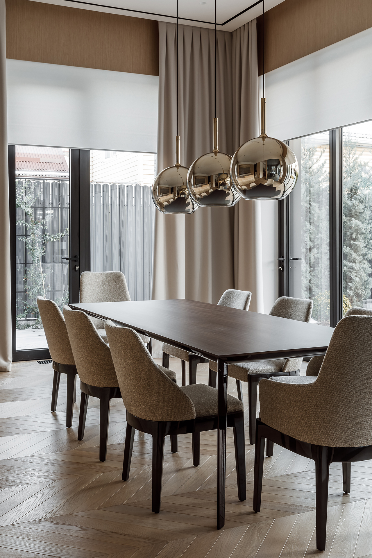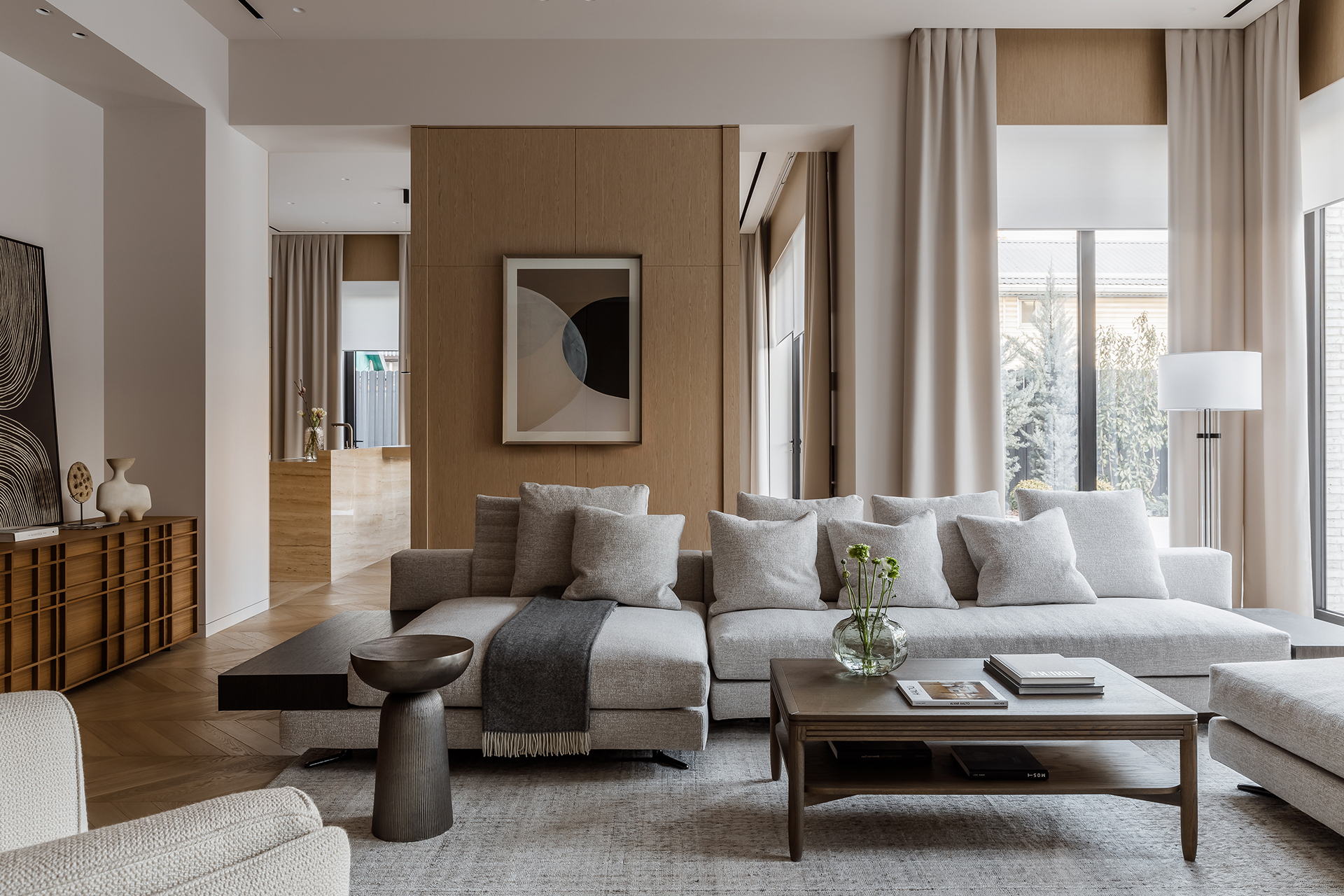 В нем до мелочей была продумана планировка, поскольку интерьер создавался сразу вместе с архитектурой дома. Мы всегда стараемся проектировать интерьер и экстерьер одновременно, чтобы площадь использовалась максимально эффективно. Первый этаж 400м2. раскрывается с холла, формируя стилистику всего пространства уже с порога. Гостей встречает винтовая лестница, отделанная натуральным дубом. Это ключевой материал в оформлении интерьера, наравне с травертином, который используется в качестве основного напольного покрытия.