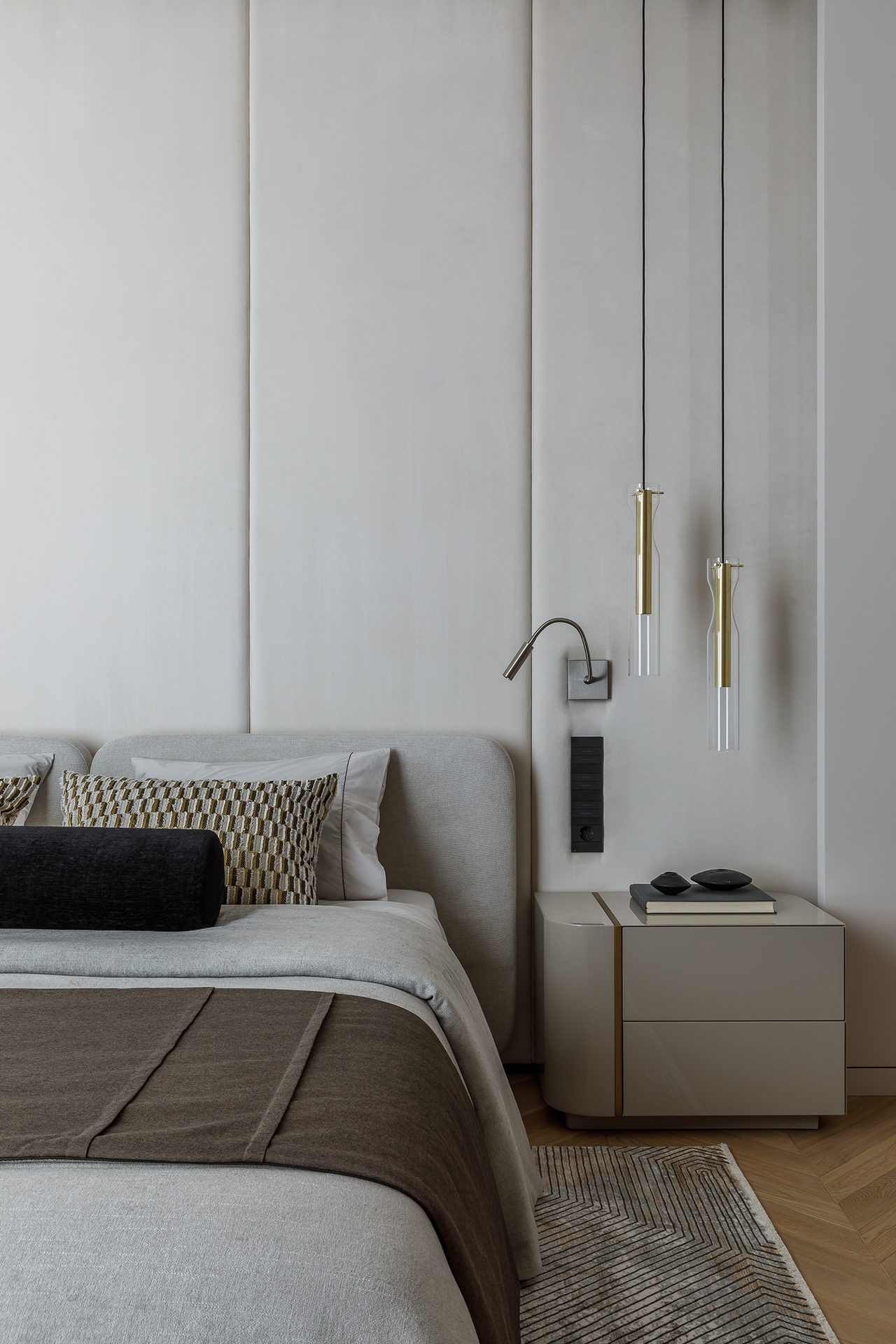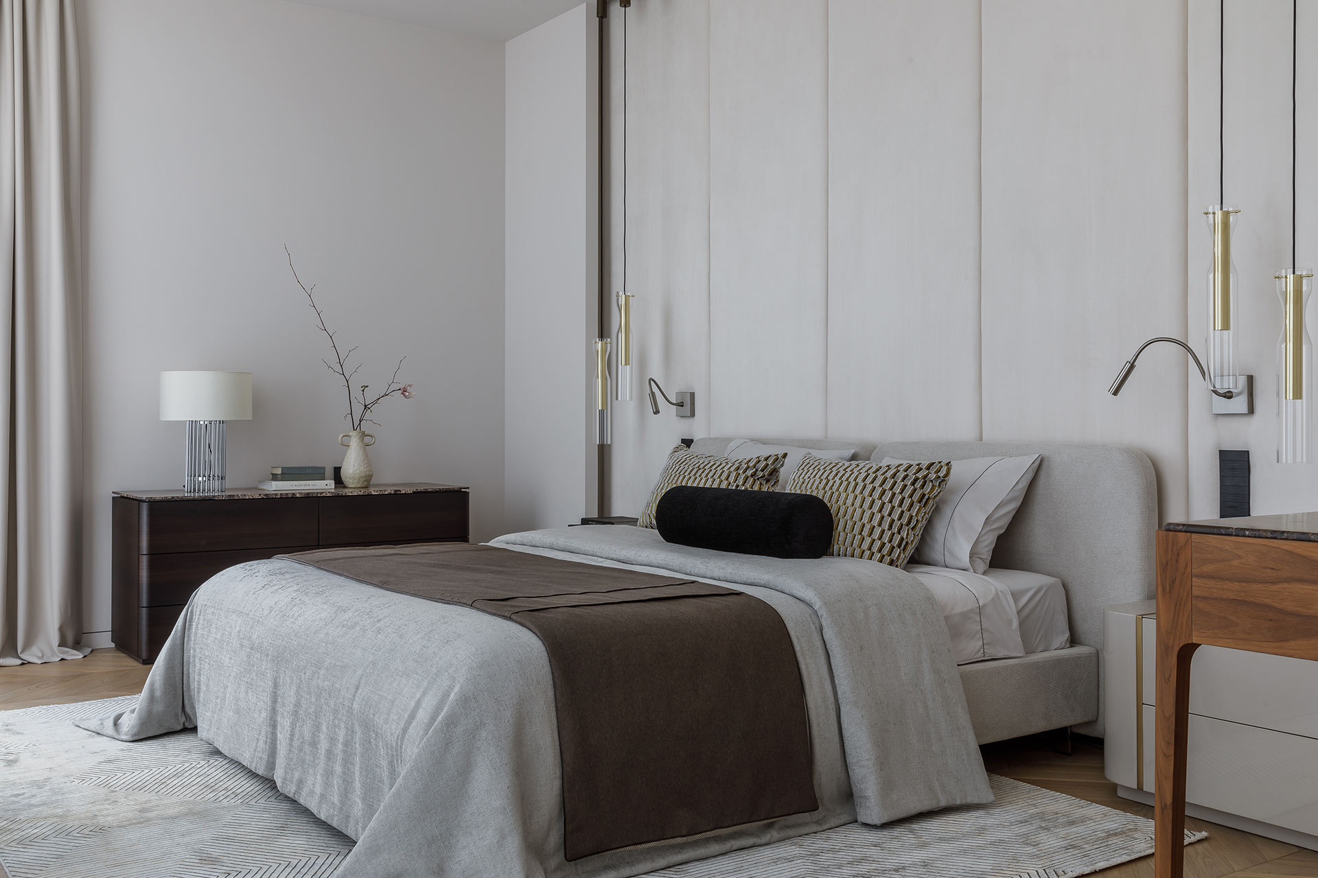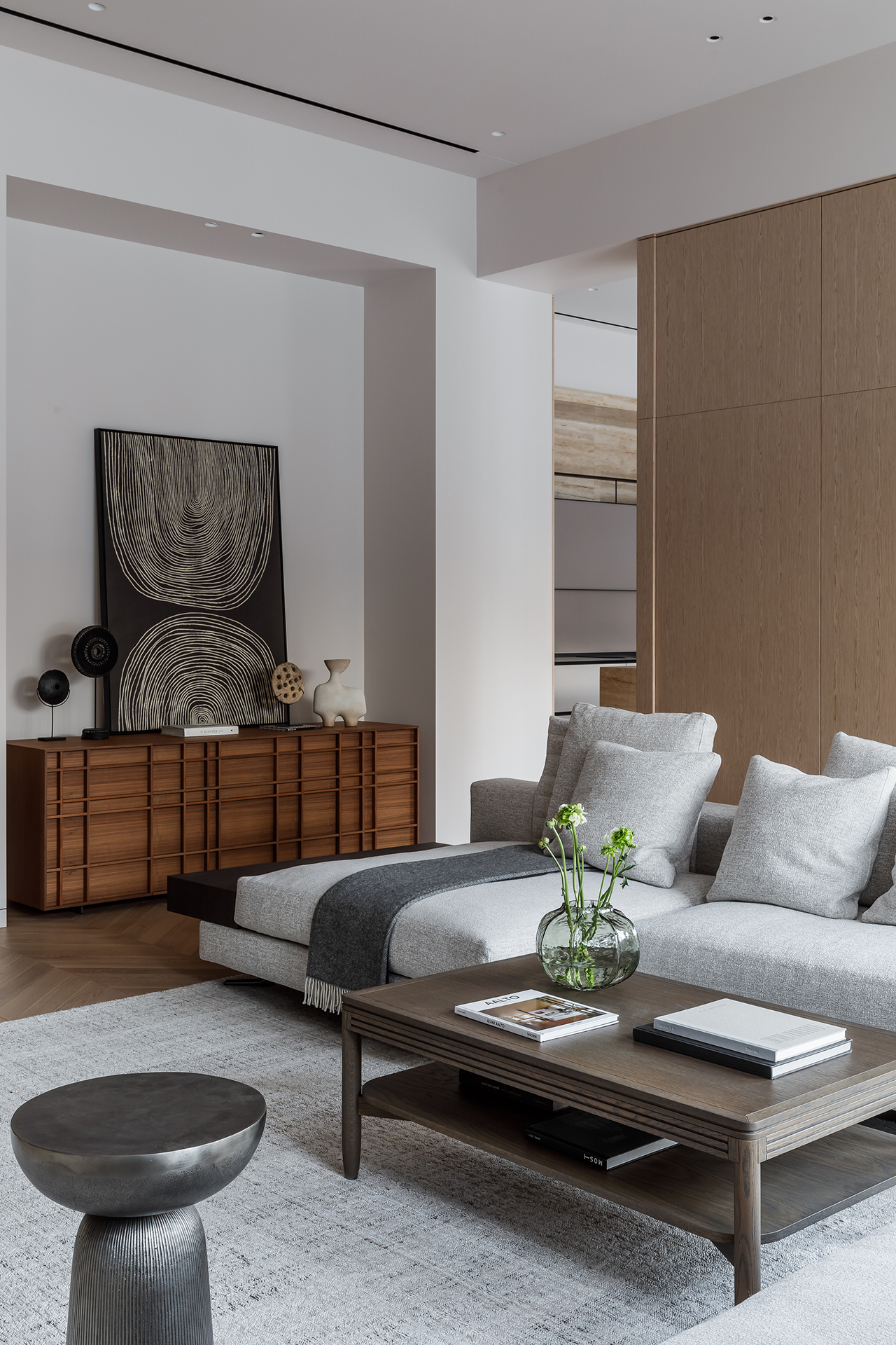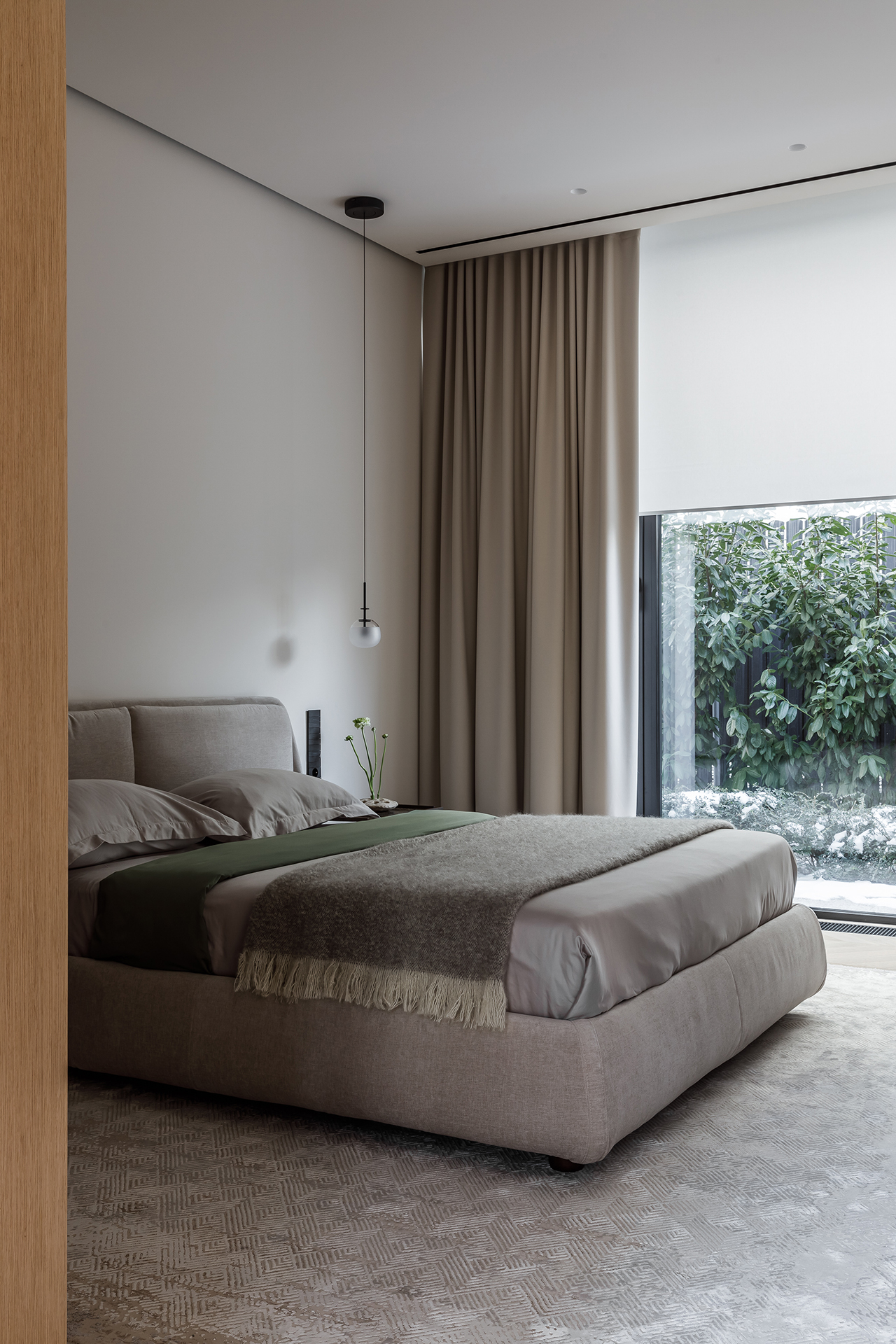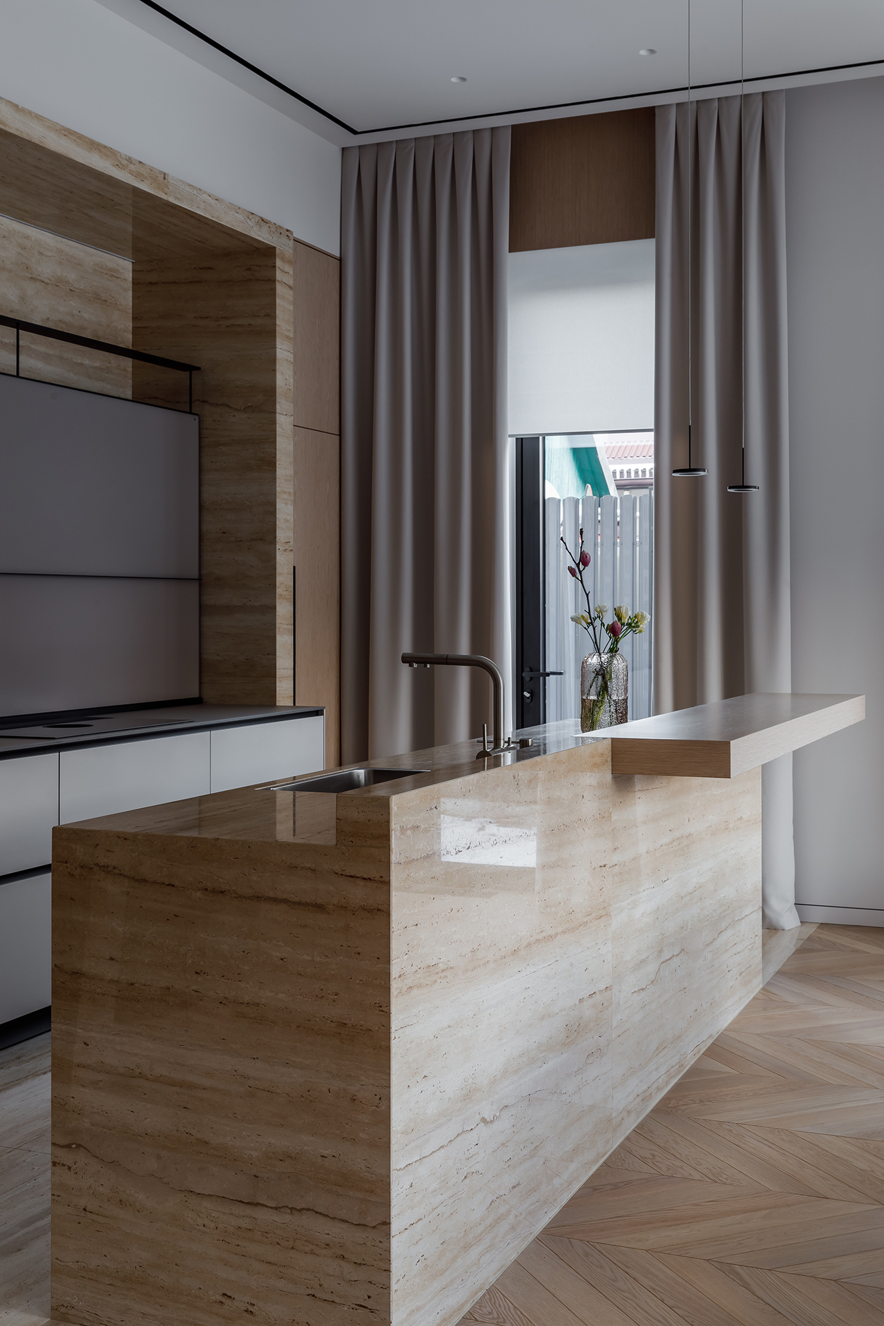 В нем до мелочей была продумана планировка, поскольку интерьер создавался сразу вместе с архитектурой дома. Мы всегда стараемся проектировать интерьер и экстерьер одновременно, чтобы площадь использовалась максимально эффективно. Первый этаж 400м2. раскрывается с холла, формируя стилистику всего пространства уже с порога. Гостей встречает винтовая лестница, отделанная натуральным дубом. Это ключевой материал в оформлении интерьера, наравне с травертином, который используется в качестве основного напольного покрытия.
