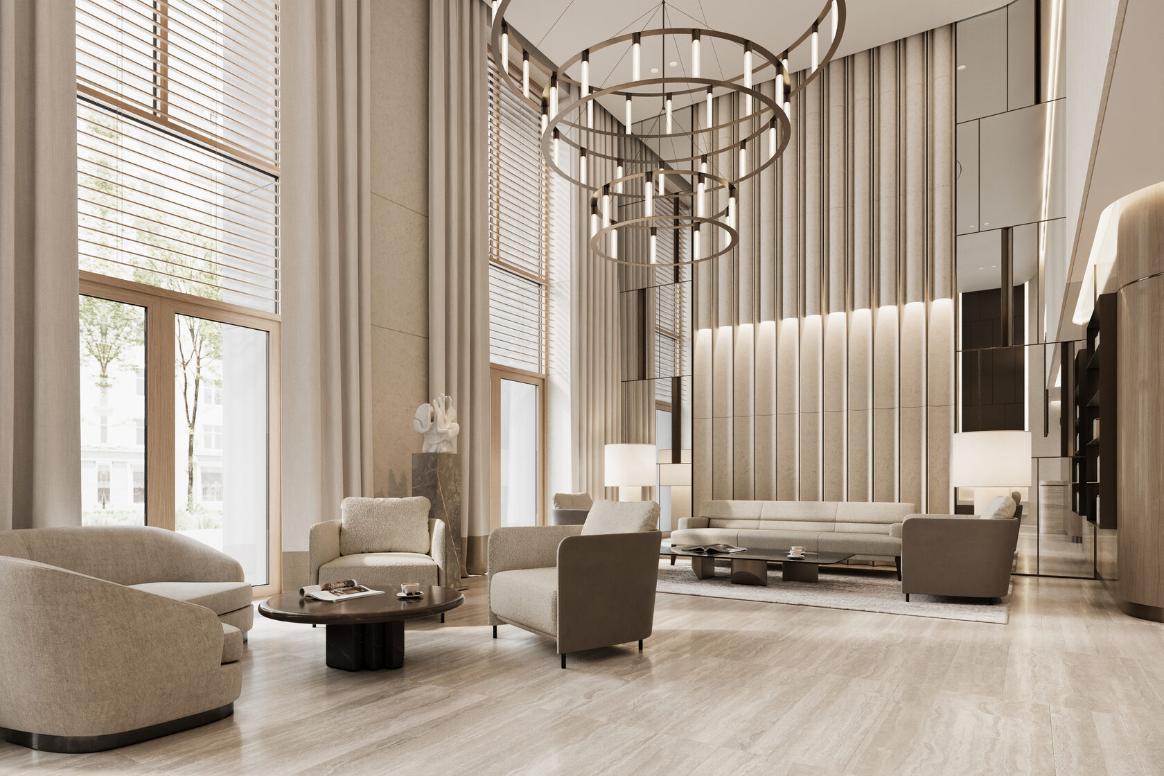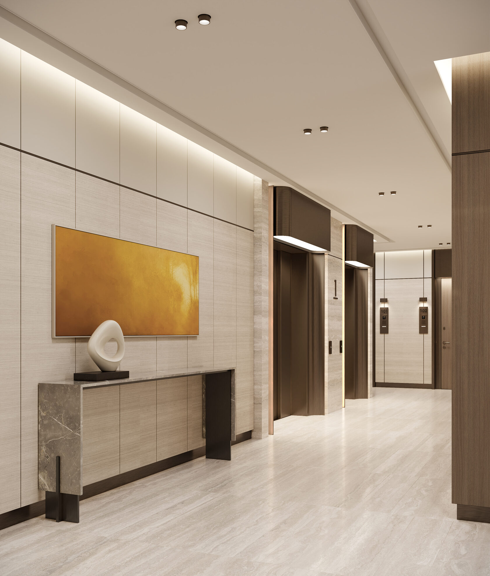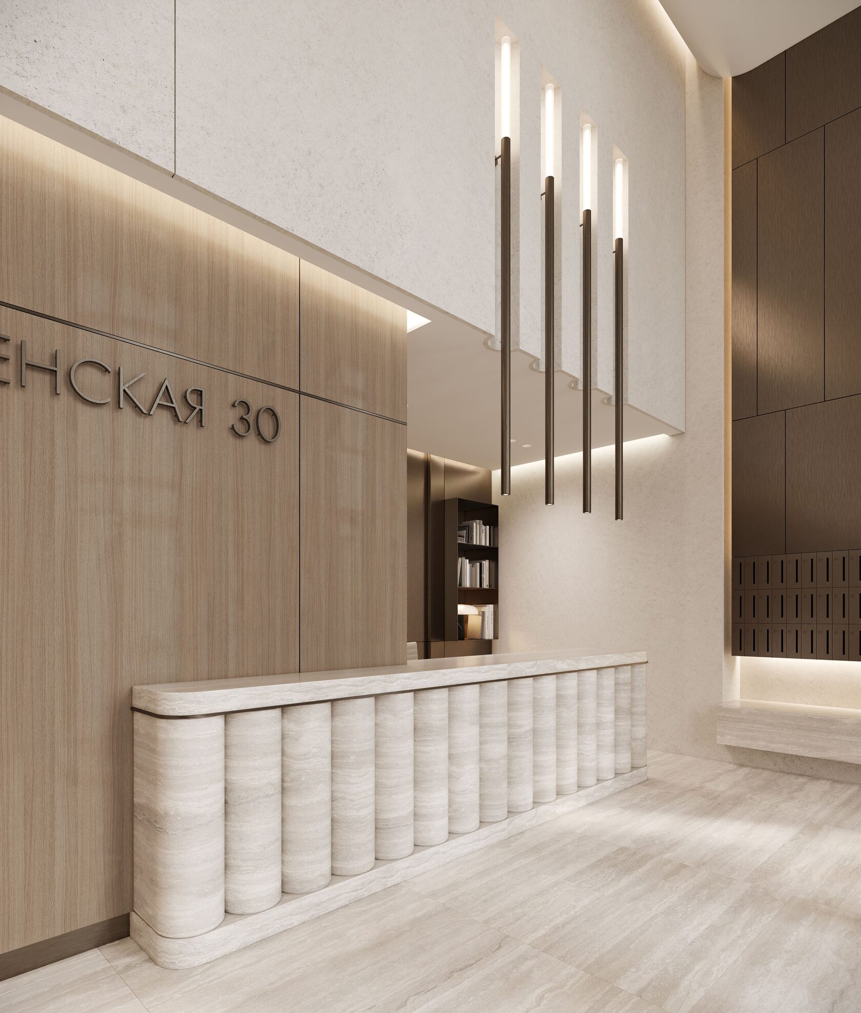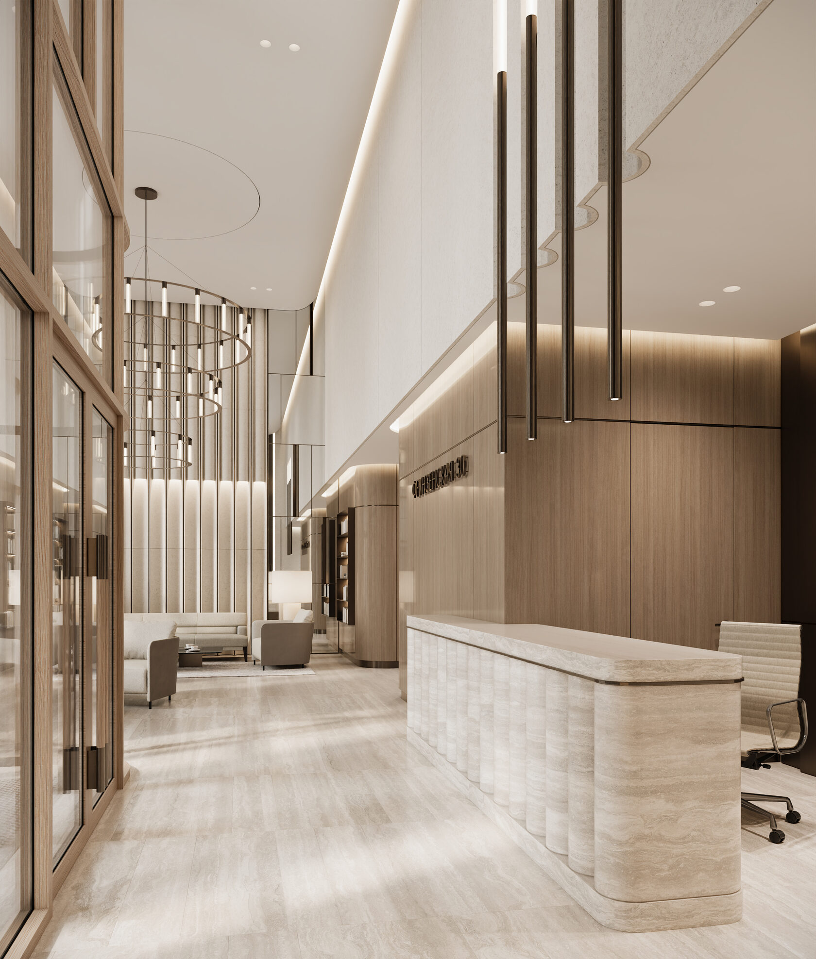 Входное лобби представляет собой светлый, элегантный интерьер. Бежевый травертин со спокойным узором прожилок создаёт уютную и приятную атмосферу, при этом поддерживая престижный и роскошный вид входной группы. В соответствии с техническим заданием, мы остановились на комфортной для глаза светлой цветовой гамме. Акценты были сделаны на декоративной штукатурке, выразительном текстиле, гладкой золотистой латуни и многоуровневом освещении, которые в комплексе призваны поддерживать психологический комфорт резидентов и гостей. Для меблирования мы использовали износостойкие ткани в оттенках охры, фактурный айвори в обивке дивана, которые добавляют интерьеру сдержанности и элегантности. Концепция интерьера призвана подарить жильцам и их гостям атмосферу уюта, как будто они сразу оказываются в холле своего домашнего интерьера.
