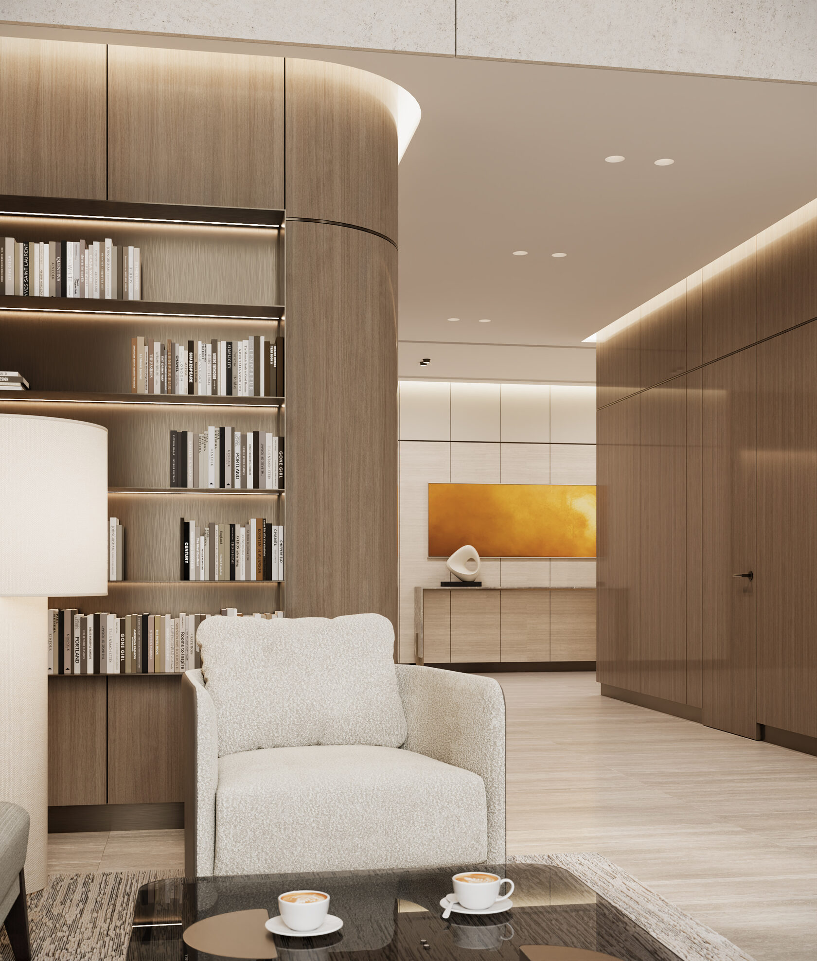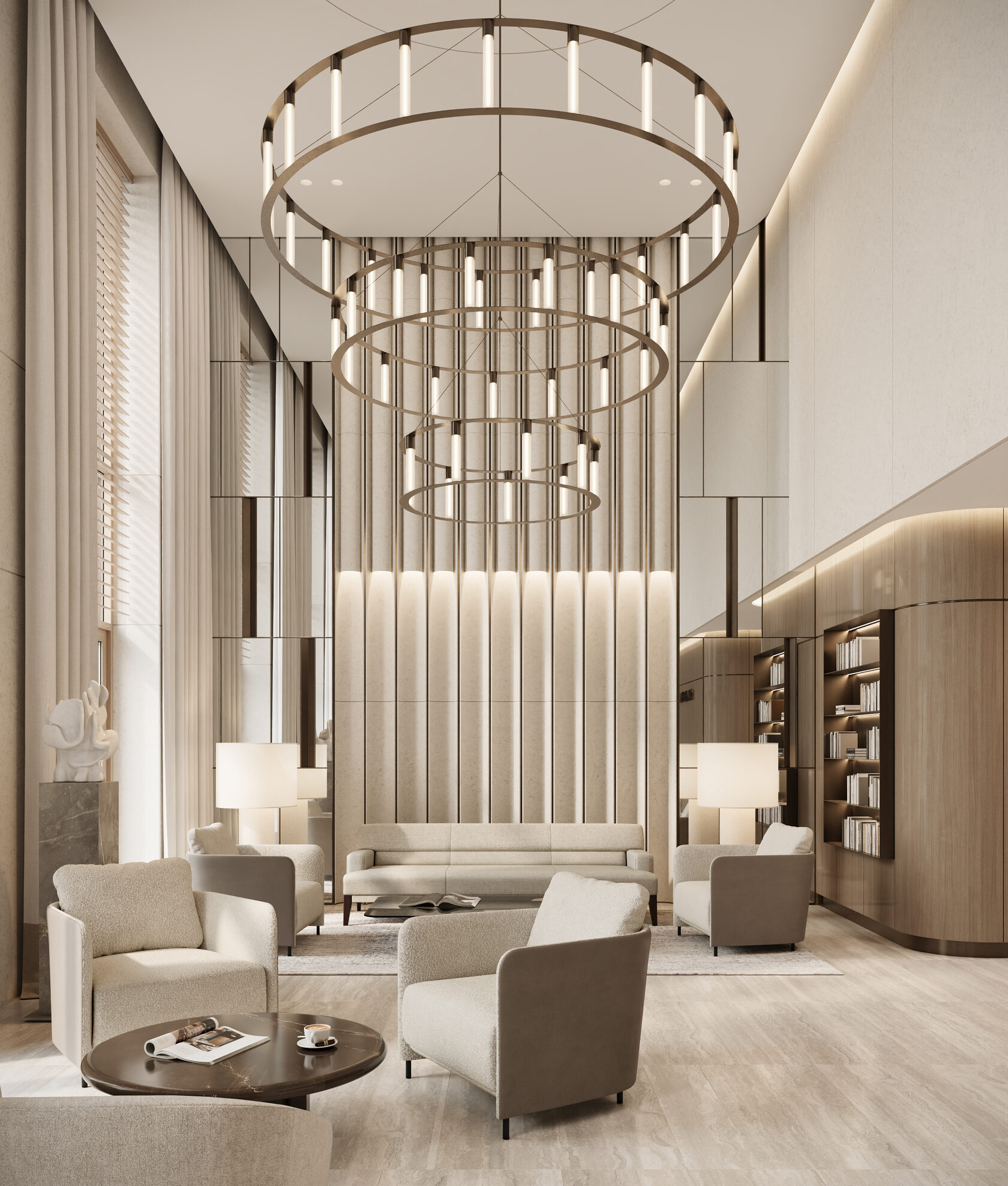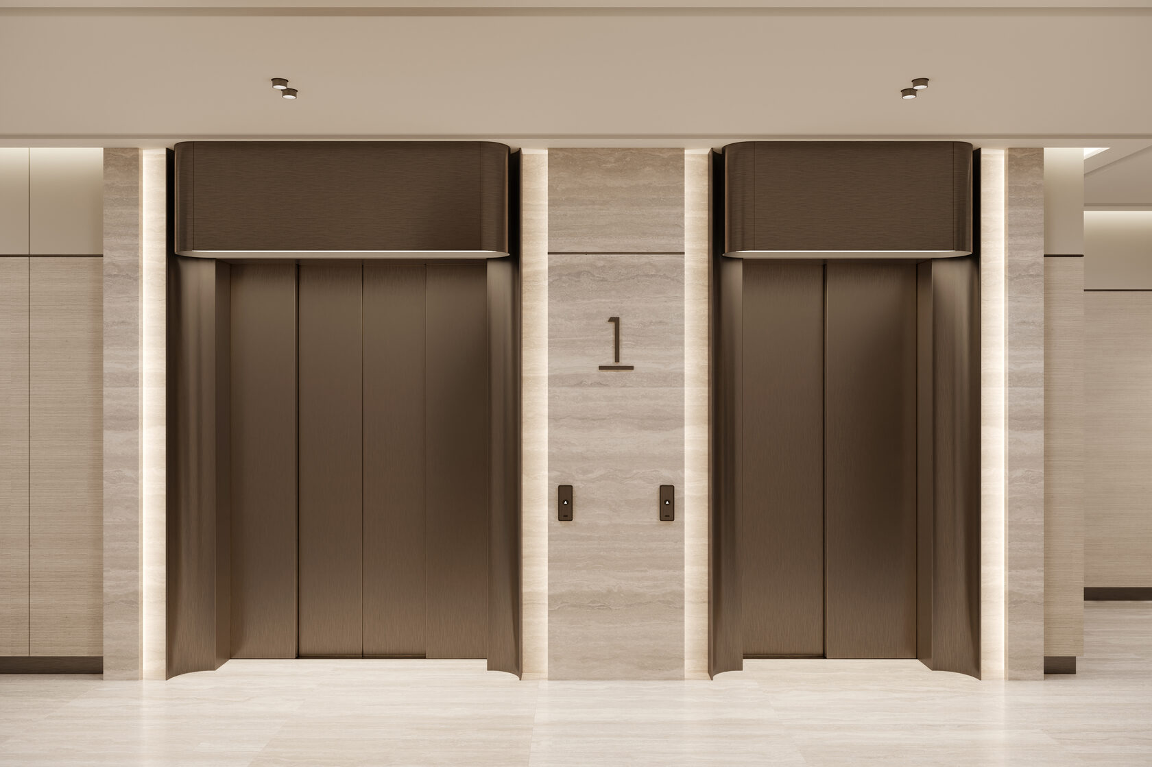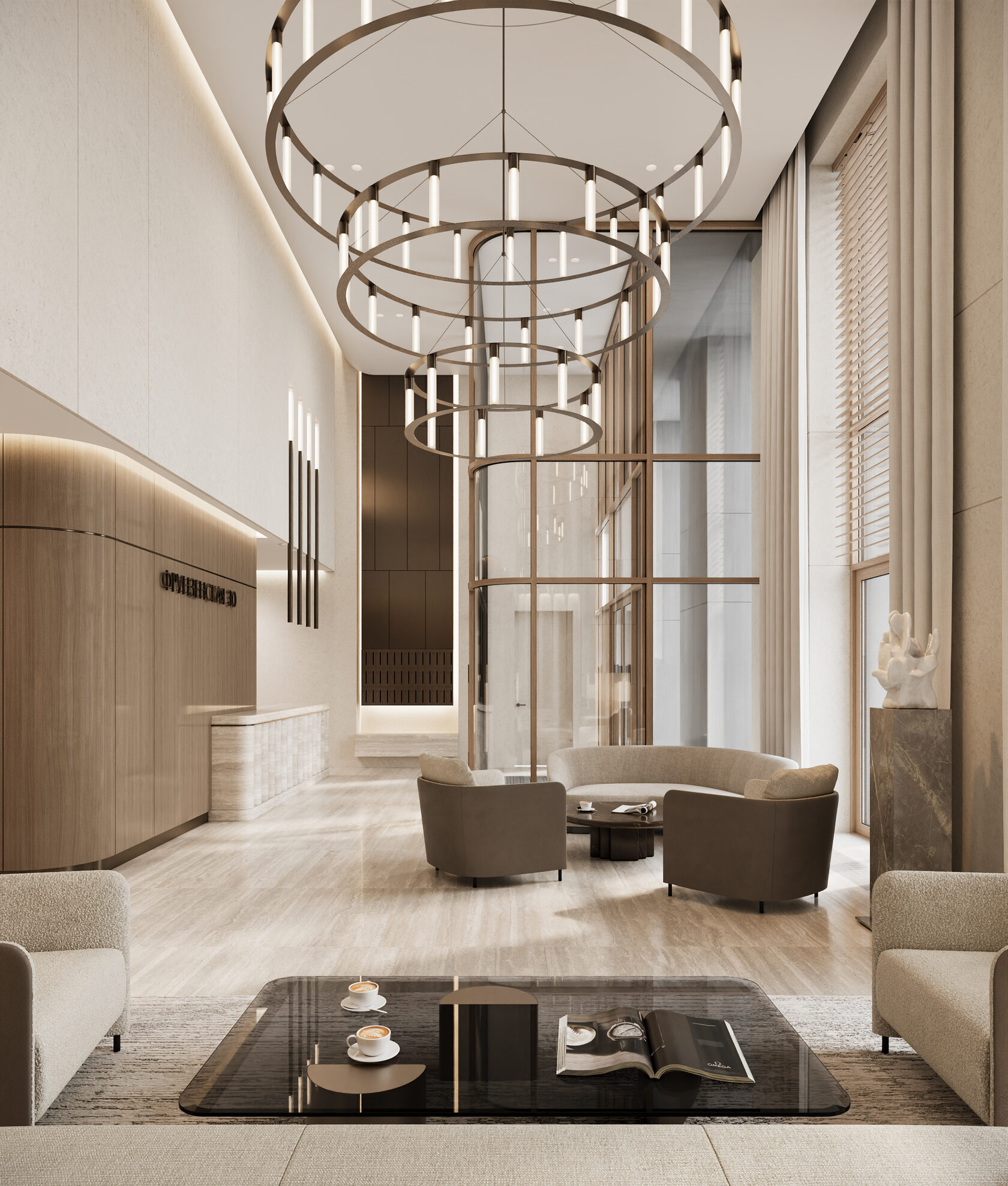 Входное лобби представляет собой светлый, элегантный интерьер. Бежевый травертин со спокойным узором прожилок создаёт уютную и приятную атмосферу, при этом поддерживая престижный и роскошный вид входной группы. В соответствии с техническим заданием, мы остановились на комфортной для глаза светлой цветовой гамме. Акценты были сделаны на декоративной штукатурке, выразительном текстиле, гладкой золотистой латуни и многоуровневом освещении, которые в комплексе призваны поддерживать психологический комфорт резидентов и гостей. Для меблирования мы использовали износостойкие ткани в оттенках охры, фактурный айвори в обивке дивана, которые добавляют интерьеру сдержанности и элегантности. Концепция интерьера призвана подарить жильцам и их гостям атмосферу уюта, как будто они сразу оказываются в холле своего домашнего интерьера.